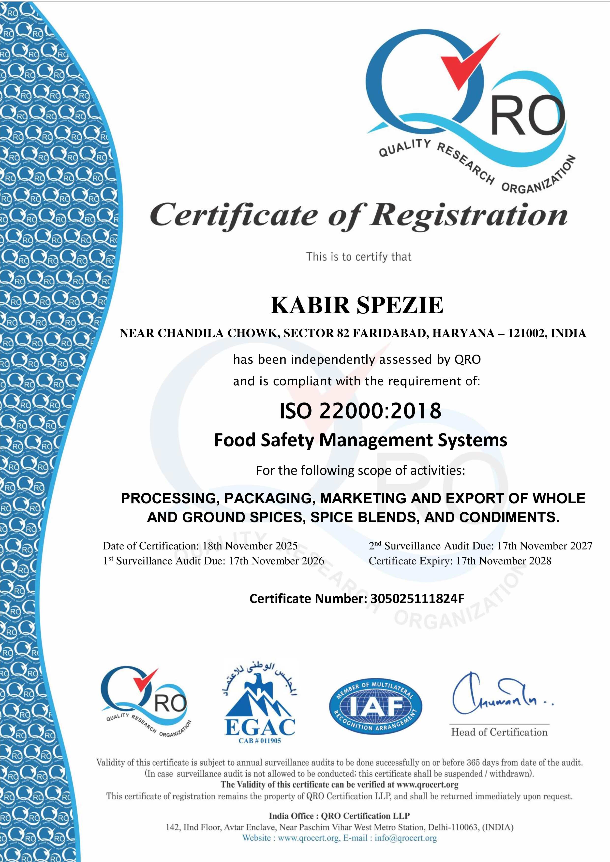 Our ISO 22000 certification demonstrates our robust Food Safety Management System, covering hazard control, hygiene practices, traceability, preventive measures, and continuous monitoring. This ensures that every export batch meets international regulatory and customer requirements with complete confidence.