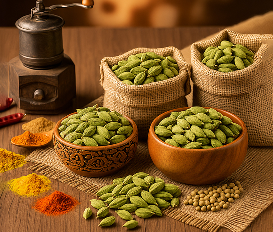 The “Queen of Spices” and one of the world’s most luxurious flavoring agents, green cardamom has a sweet, floral aroma with citrus undertones. From Arabic coffee and Middle Eastern sweets to European confectionery and Indian chai, cardamom defines premium taste. Beyond flavor, it aids digestion, freshens breath, and detoxifies. With exceptionally high demand in Gulf, European, and North American markets, green cardamom is a crown jewel of Indian spice exports.