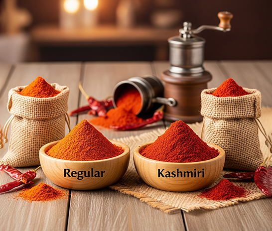 Our regular red chili powder delivers bold heat, while Kashmiri chili powder adds a beautiful red color with a milder spice level. Both are indispensable in global spice blends and sauces.